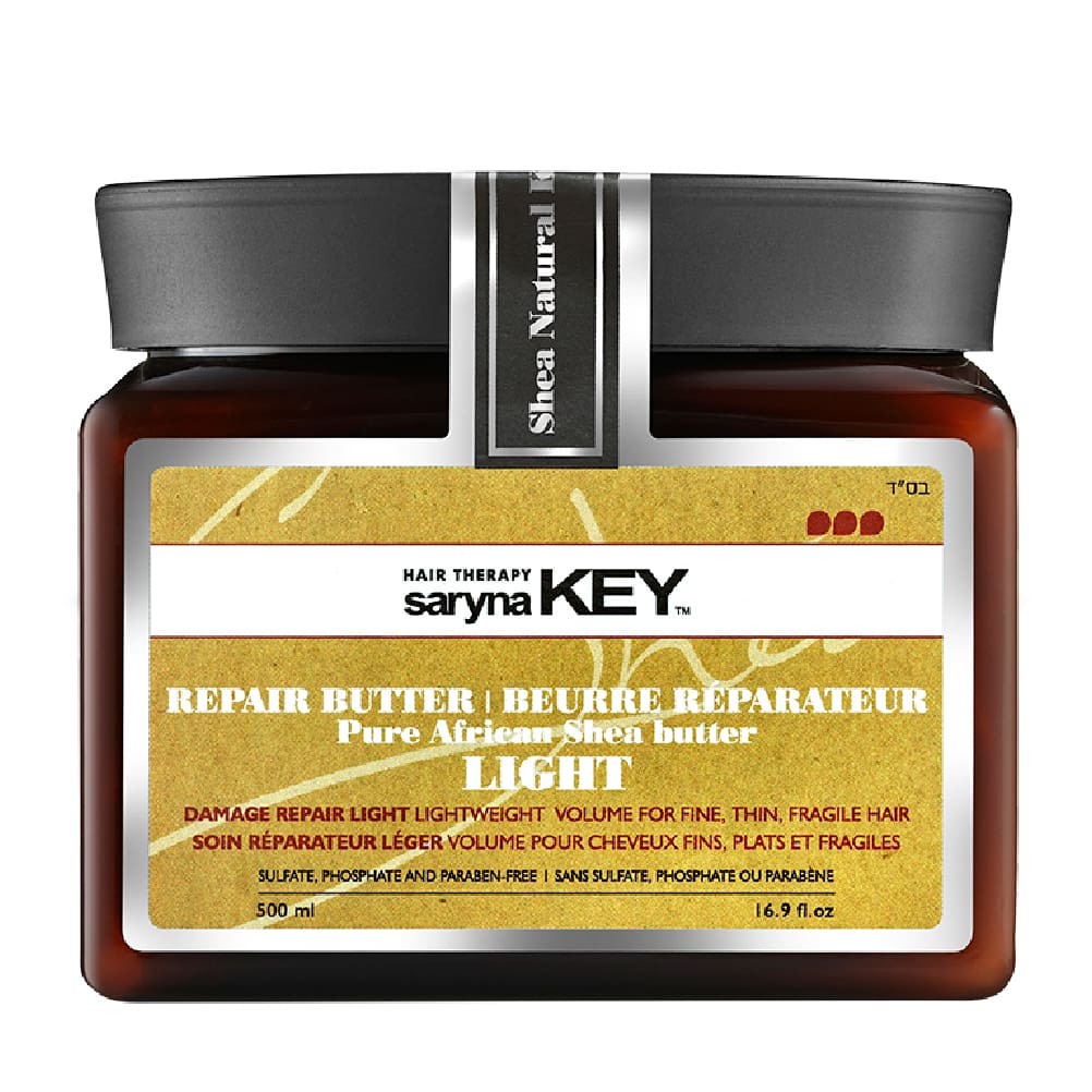 Damage repair butter light (manteca ligera reparadora de daños) de Saryna Key hidrata y repara el pelo fino, adelgazado y/o frágil.