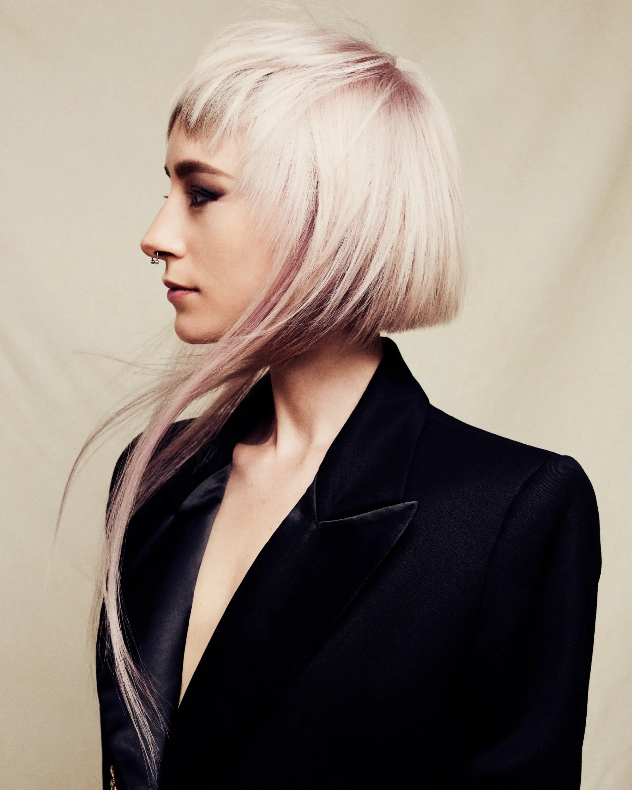 El bob desconectado con mini fringe y shadow roots caoba pastel, la dan un efecto en el que las raices dan profundidad, el degrade hacia medios y puntas estiliza. El fleco mini abre el rostro con expresión. Es dandi, sí, pero con un toque editorial que invita a mirar más de una vez.